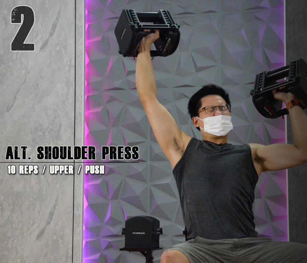 นั่งหลังตรงบนม้านั่ง จากนั้นเริ่มออกแรงเกร็งกล้ามเนื้อไหล่เพื่อยกดัมเบลขึ้น – ลง สลับกันทีล่ะข้าง