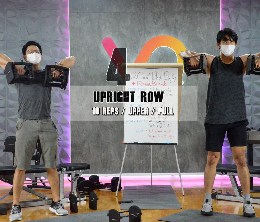 ยืนตัวตรงแยกขาเท่าช่วงไหล่ จากนั้นเริ่มออกแรงเกร็งกล้ามเนื้อไหล่เพื่อยกดัมเบลข้ึนดึงศอกขึ้นเป็นตัว V