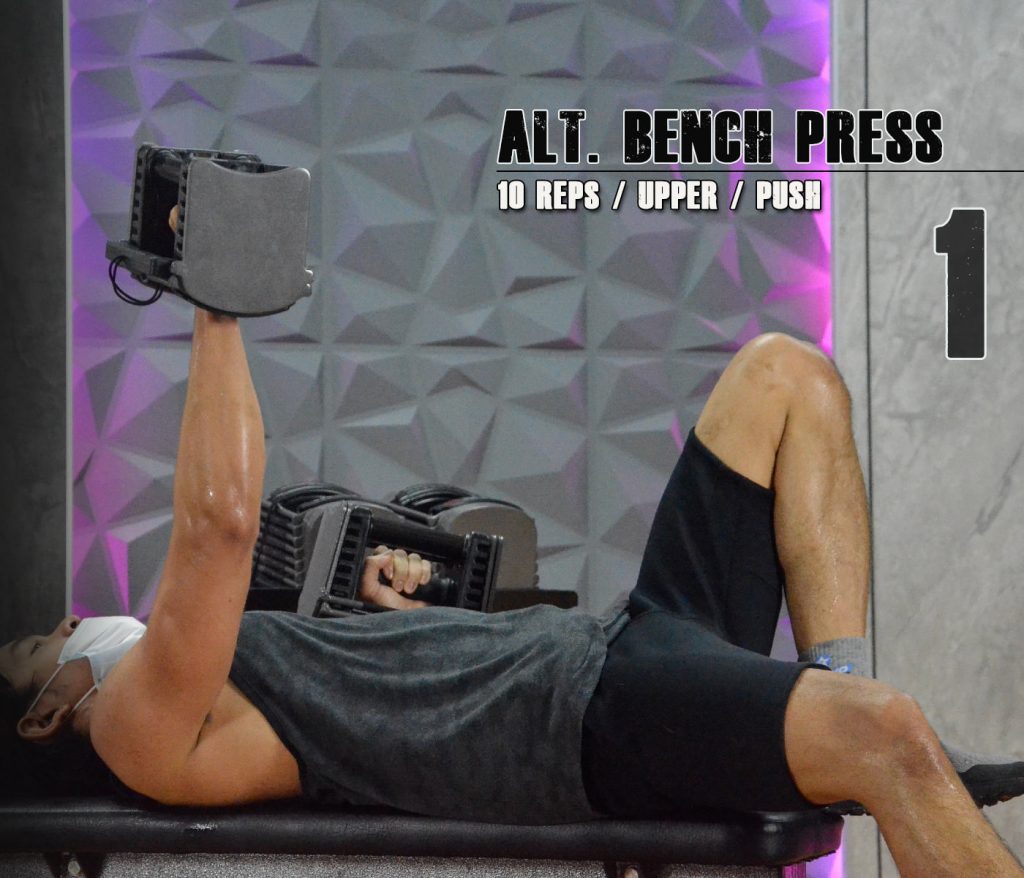 นอนหงายหน้าบนม้านั่ง จากนั้นเริ่มออกแรงเกร็งกล้ามเนื้อหน้าอกเพื่อยกดัมเบลขึ้น – ลง สลับกันทีล่ะข้าง