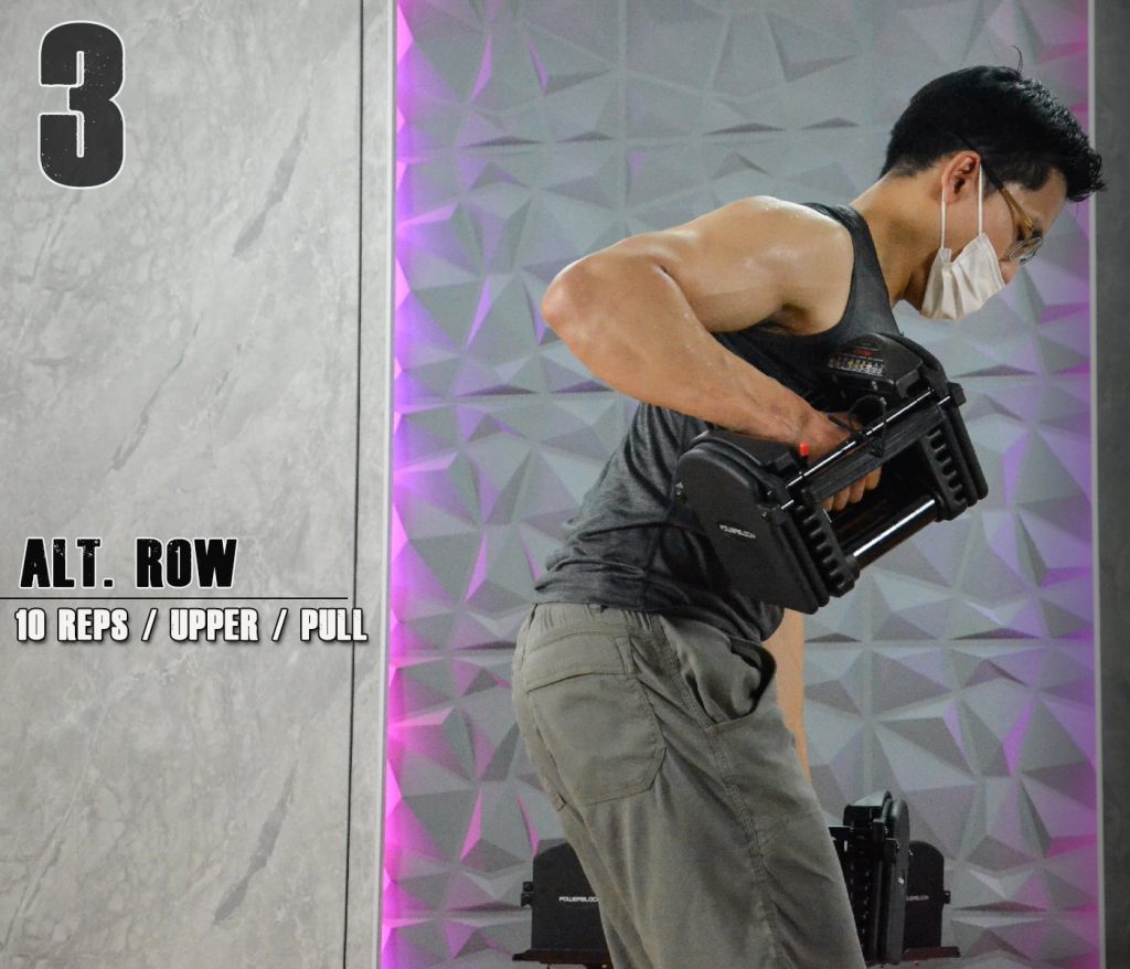 ยืนโน้มตัวไปด้านหน้าเล็กน้อย จากนั้นเริ่มออกแรงเกร็งกล้ามเนื้อหลังเพื่อยกดัมเบลเข้าหาตัว สลับกันทีล่ะข้าง